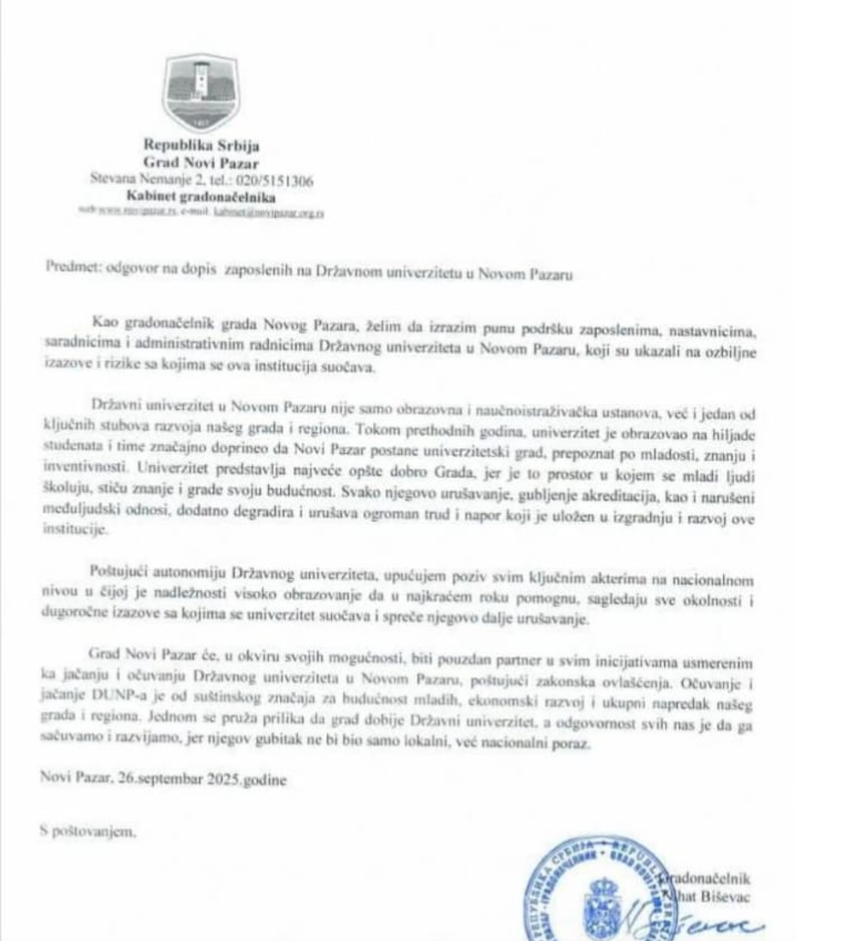 Gradonačelnik Novog Pazara Nihat Biševac izrazio je punu podršku zaposlenima, nastavnicima, saradnicima i administrativnim radnicima Državnog univerziteta u Novom Pazaru, koji su ukazali na ozbiljne izazove i rizike sa kojima se ova institucija suočava, stoji u odgovoru koji je upućen zaposlenima, a koji je objavljen na društvenoj mreži fejsbuk.