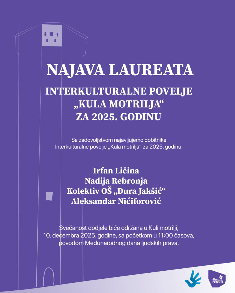 Dodelom Interkulturalne povelje „Kula motrilja“ Forum 10 nastavlja da prepoznaje i podržava pojedince i kolektive koji svojim delovanjem jačaju vrednosti dijaloga, solidarnosti i međusobnog poštovanja. Ova priznanja predstavljaju podsticaj za dalje izgrađivanje otvorenog, pravednog i inkluzivnog društva.